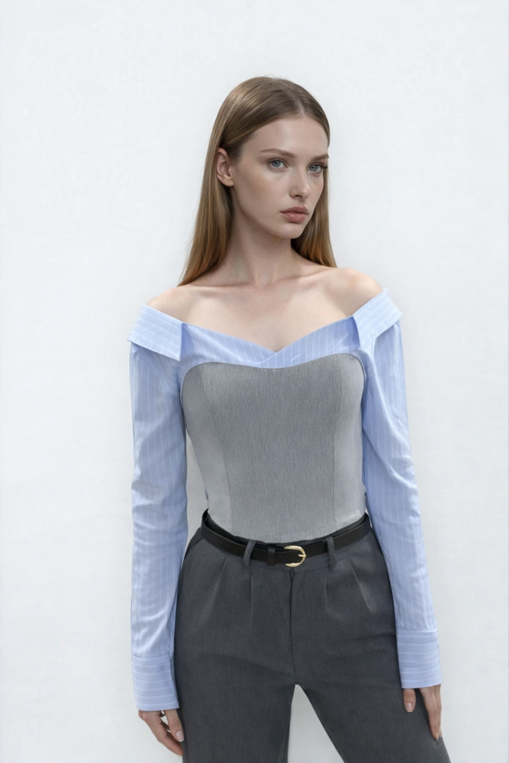 Omuzları açık tasarımlı, gömlek yaka detaylı, önü kontrast kumaşlı, yandan fermuar kapamalı, uzun kollu bluz. Dar kalıptır, ara bedenlerin 1 beden büyük alması önerilir.