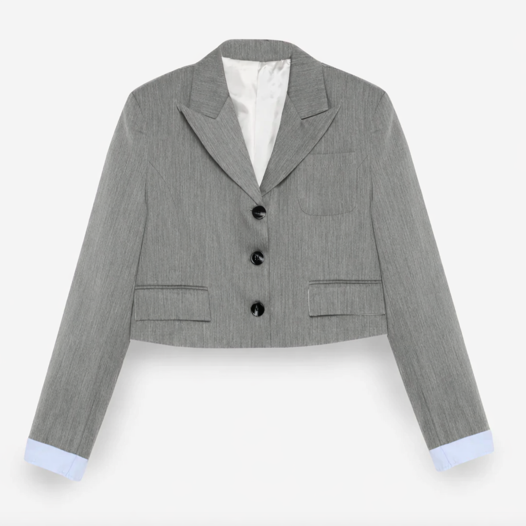 İçi astarlı, düğme kapamalı, cep kapak detaylı, vatkalı, uzun kollu, bilekleri kontrast renkli kumaş garnili, küçük cep detaylı, crop boy blazer ceket.