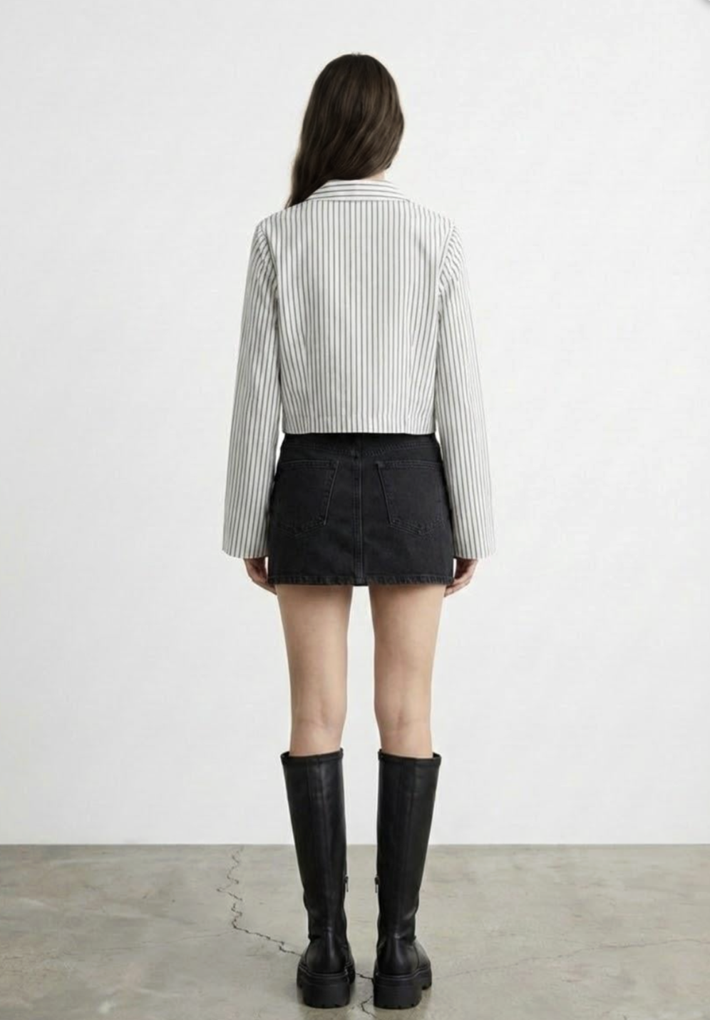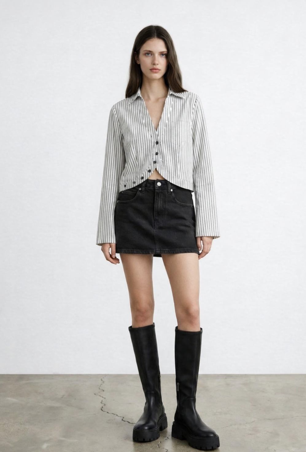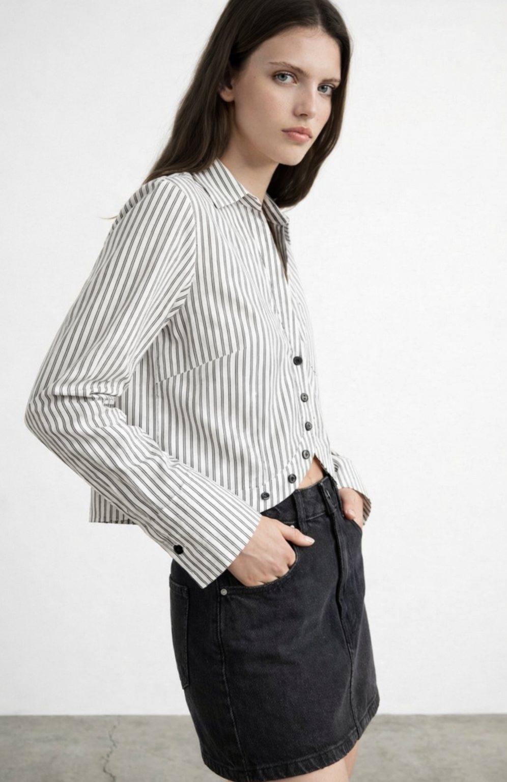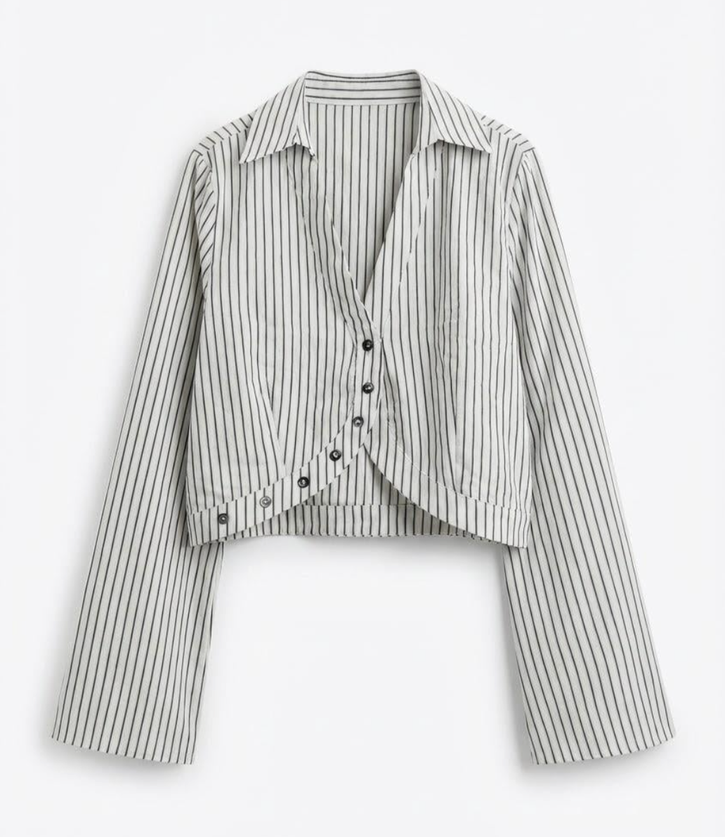 Çizgili, alt kısmı hafif V formunda bitişli, crop gömlek.