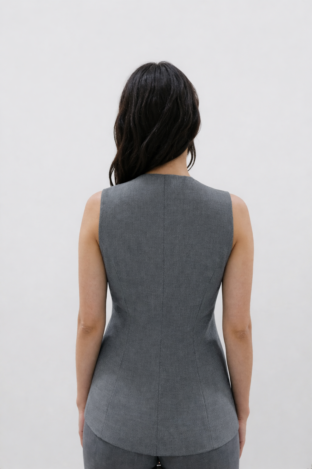 İçi kendi renginden astarlı, yuvarlak yaka, önden düğme kapamalı, cepli, önü yırtmaç detaylı, kolsuz yelek. Ürünün kalıbı geniştir, ara bedenlerin 1 beden küçük alması önerilir.