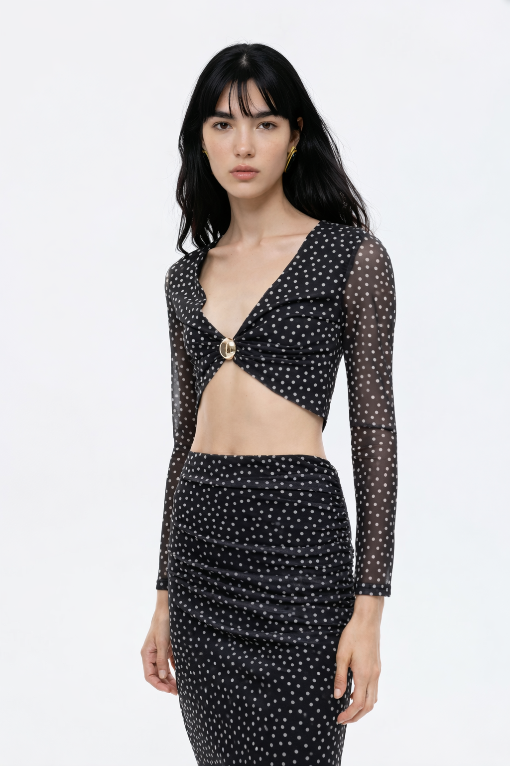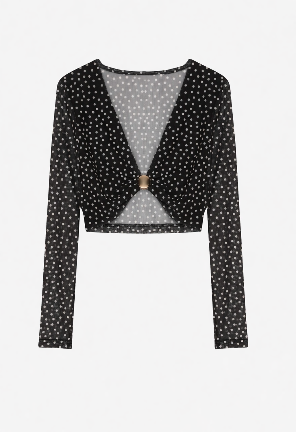 İçi astarsız, full transparan görünümde tül kumaştan, uzun kollu, puantiye desenli, önü gold toka aksesuarlı, crop bluz.