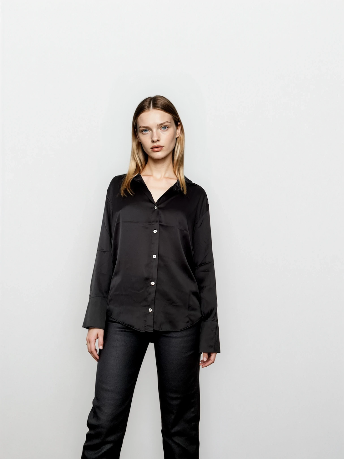 Siyah Saten Dökümlü Gömlek.