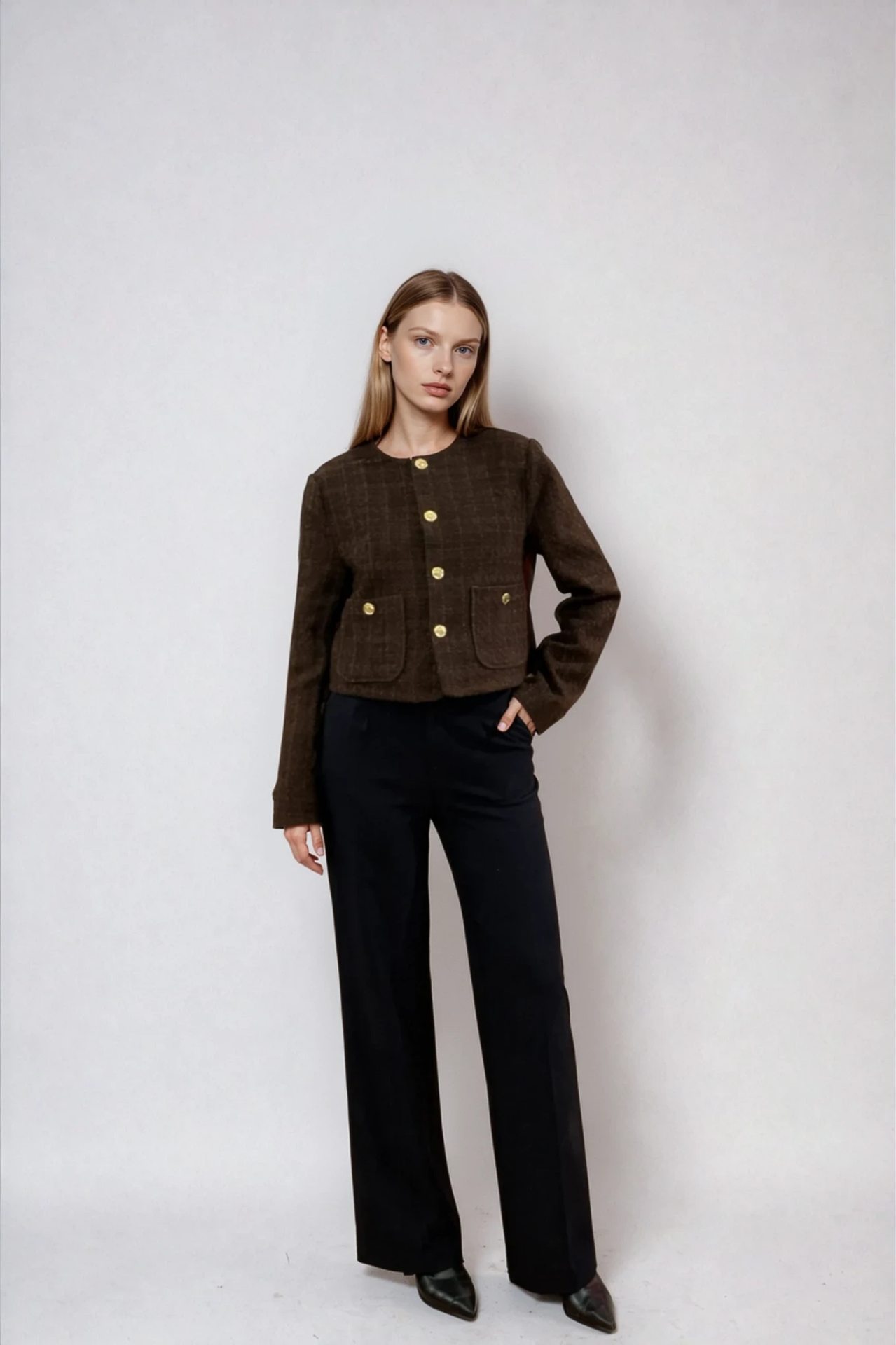 Önü gold düğmeli, yuvarlak yakalı, cebi düğme kapamalı, uzun kollu, omzu vatkalı, içi astarlı, kısa boy tüvit ceket.