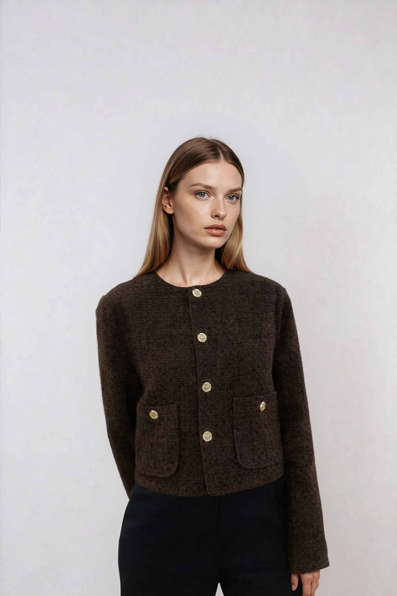 Yuvarlak Yaka Gold Düğmeli Tüvit Ceket Kahverengi - M